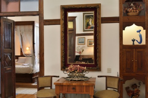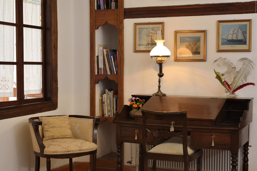 “Stolios” is a type of drawer above the staircase, useful to the needs of the upper floor. Just look and study the desk, an original piece of furniture in the mayor’s residence, saved here since the 1859. The oil painting in a Greek traditional dress above the desk reminds of the roots of the family… and the brass lamp on the desk, sends its light to the oil painting and the Greek beauty!
