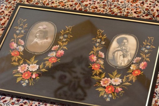 The bridal sleepers, hand embroidered by granny for the beloved daughter of the family who left to marry in America. …and the gaps were filled with the photos of the immigrated beauty, and the sleepers became a decorative memory!...